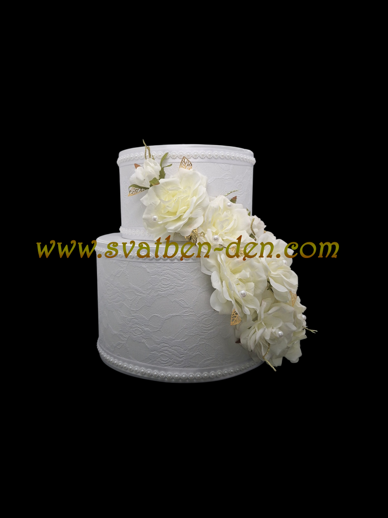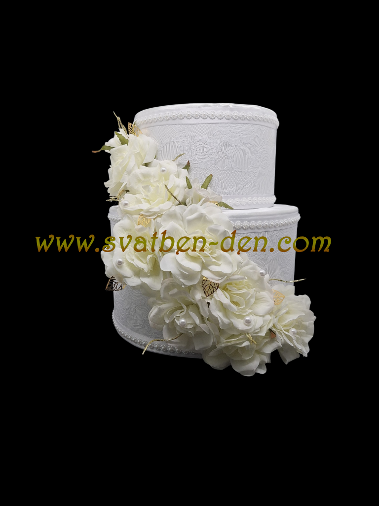 Бяла кутия пит торта с облякна с бяла дантела сатен ,бели перли,изкуствени рози, бяла хортензия, златни листенца и бели перли.