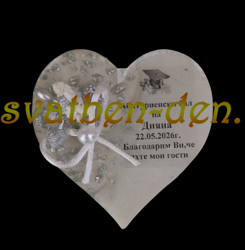 Сребърно сърце от епоксидна смола украсено с бял шнур ,бяла перла и бял и сребърен гипсофил и надпис.