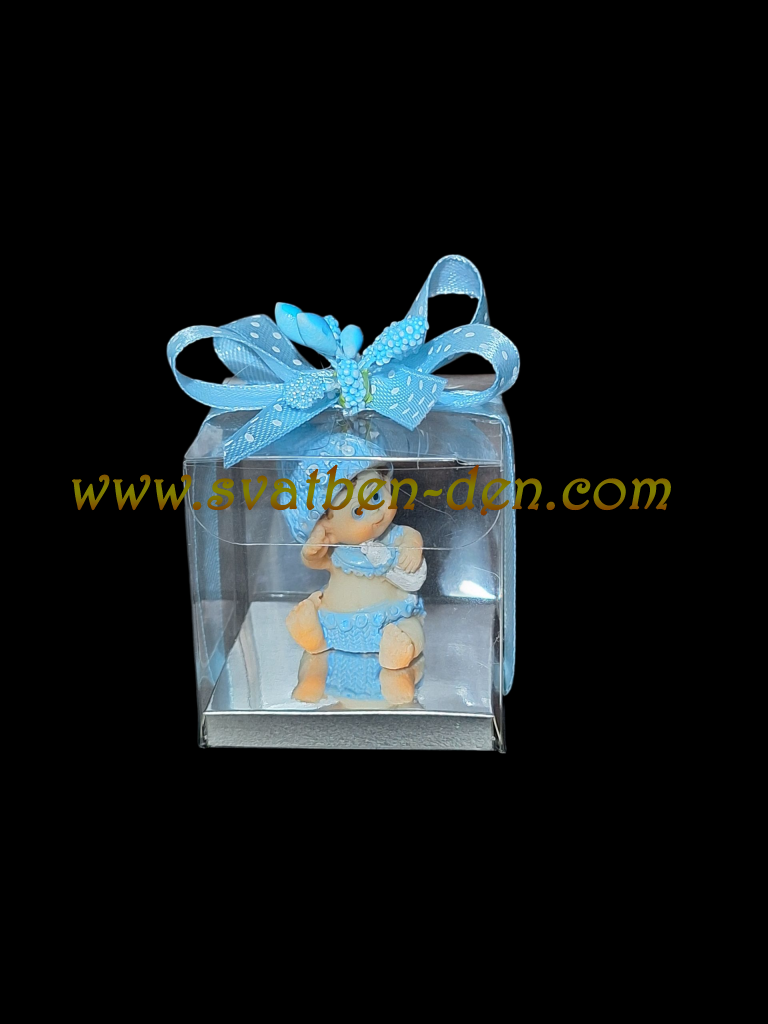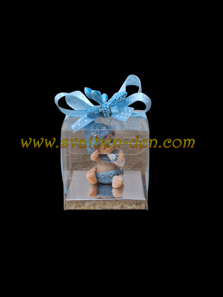 Бебе с шише в прозрачна кутийка 5 см/5см с сребърно дъно украсена със синя панделка и сини тичинки.