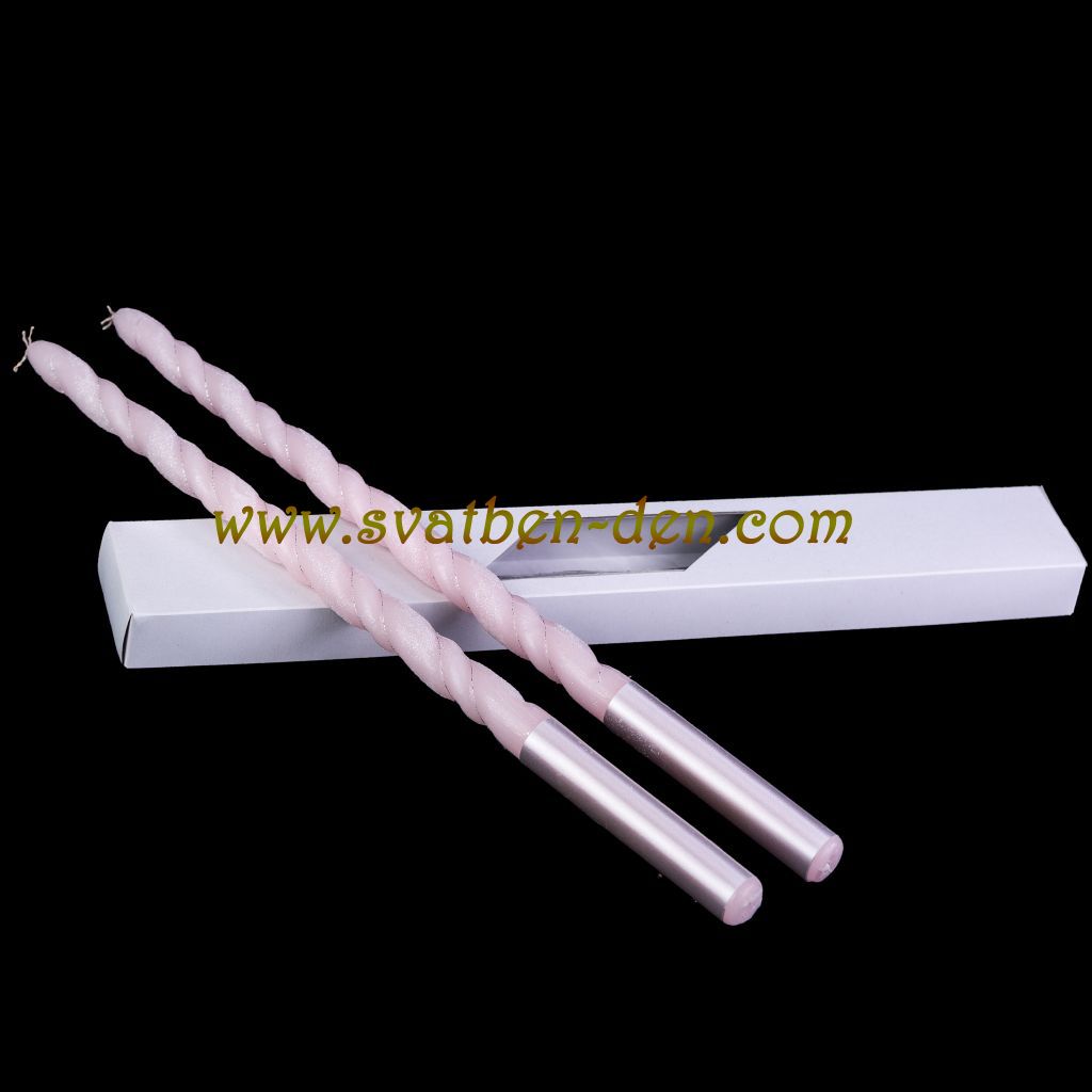 Комплект свещи за кръщене. Формата им е спираловидна, украсени със сребърна/златна нишка и бял брокат.