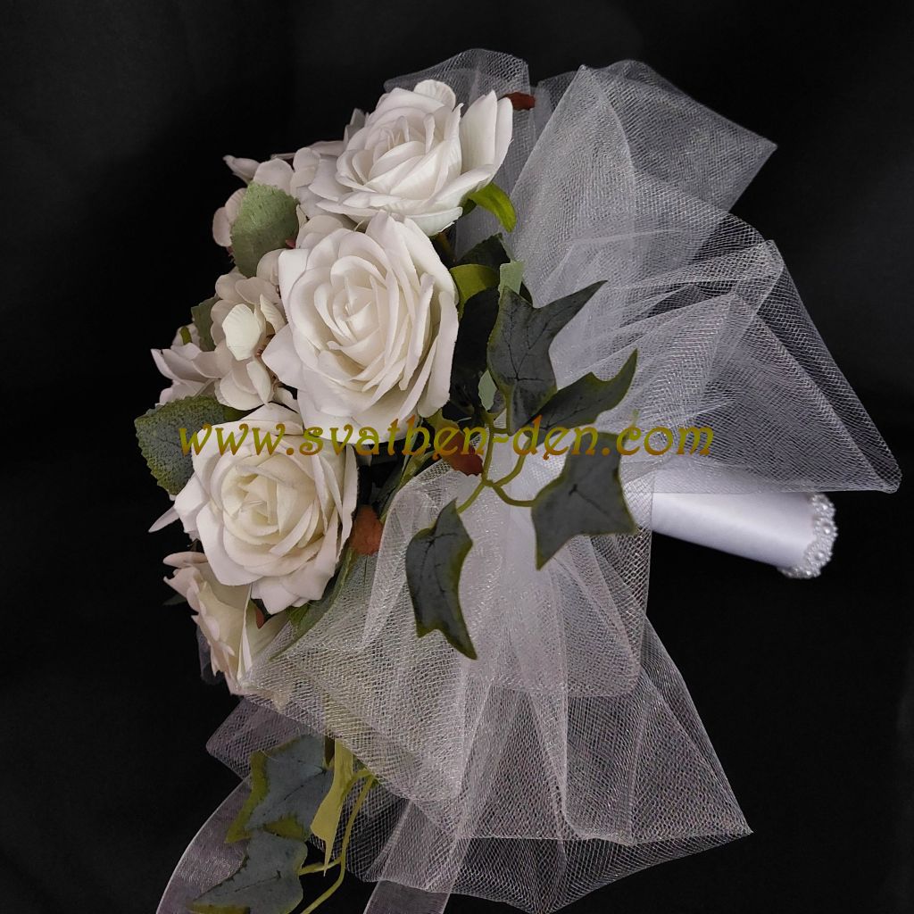Букета е изработен с изкуствени рози, зелени листа, гипсофил, хортензия и малки цветове.