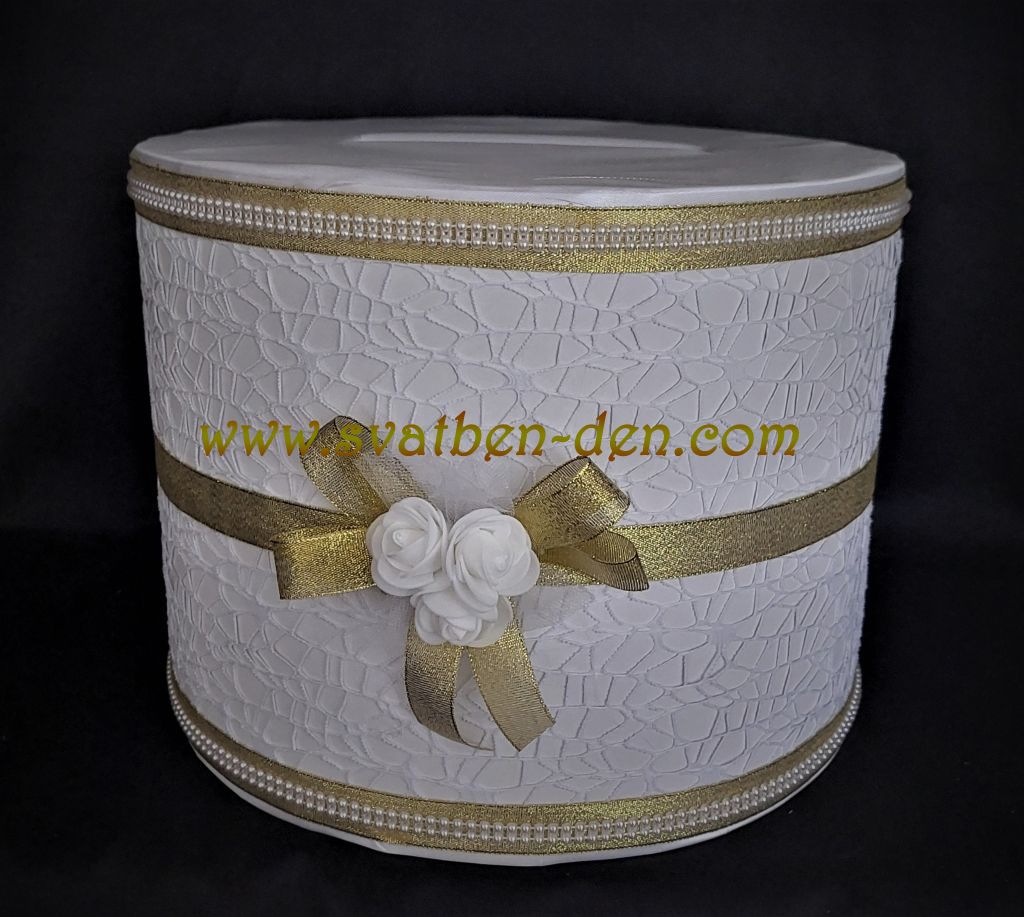 Кутия зя пари и пожелания украсени с сатен,бяла мрежа,сатенини златни ленти обкантени с перли и бели фоам рози.