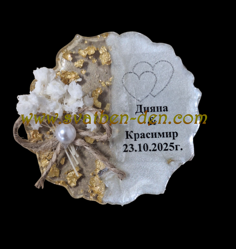 Подарък от епоксидна смола украсено с канап ,бяла перла и бял гипсофил.Надпис на имена и дата.