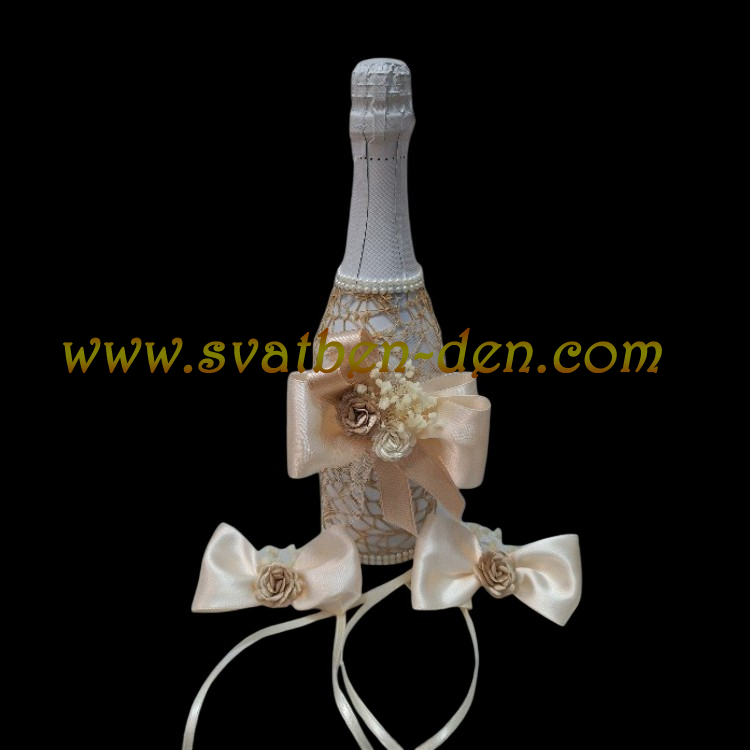 Украсено шампанско с екрю сатенина панделка с цъфнали розички и сух гипсофил