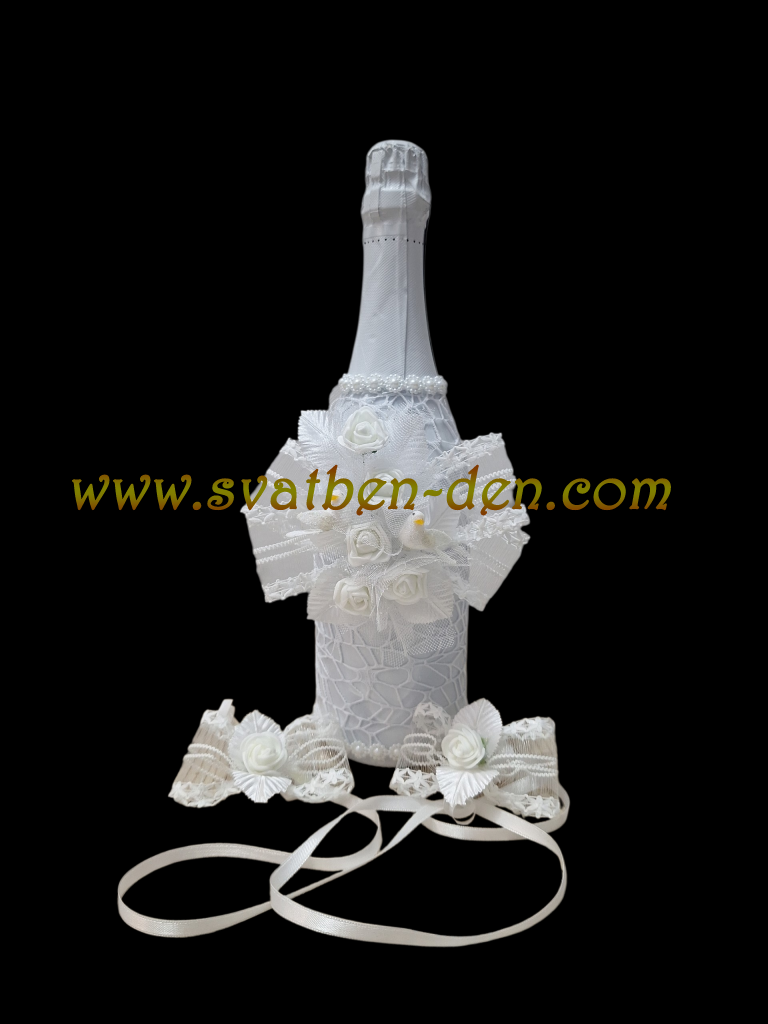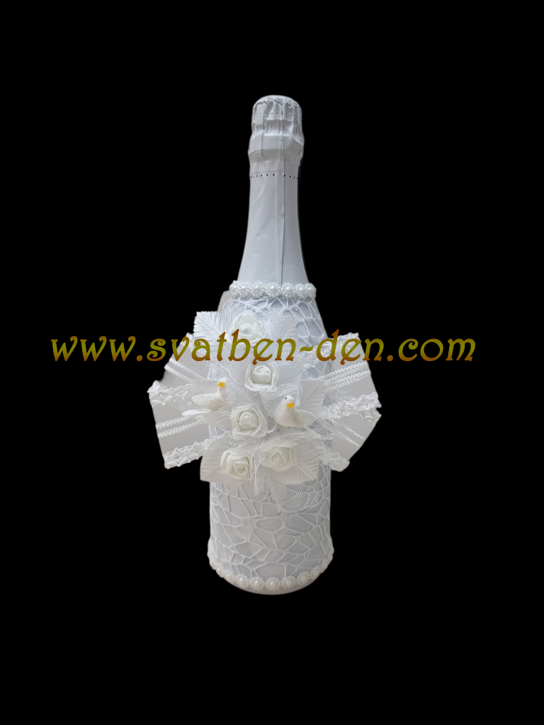 Украсено сватбено шампавско с бяла мрежа,бяла дантелина панделка ,бели рози и две бели гълъбчета.